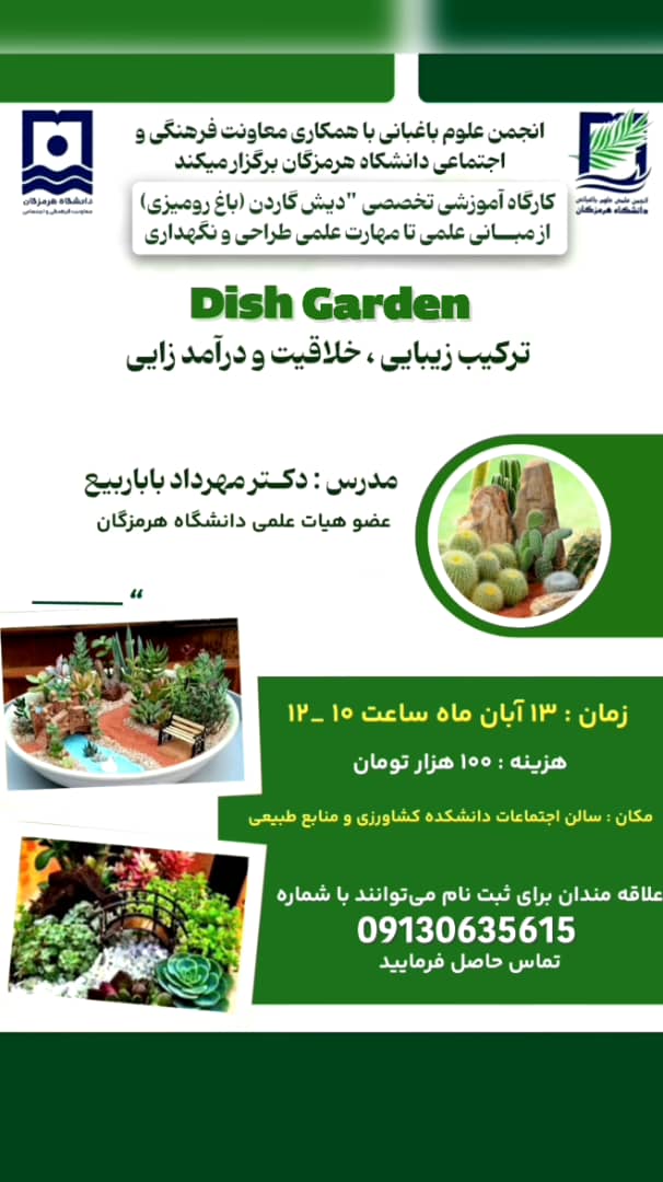 انجمن علمی علوم باغبانی دانشگاه هرمزگان با همکاری معاونت فرهنگی و اجتماعی، در راستای گسترش آموزش‌های کاربردی و تلفیق هنر و علم باغبانی، کارگاه آموزشی «باغ رومیزی (Dish Garden)» را برگزار می‌کند. این کارگاه تخصصی با تدریس دکتر مهرداد باباربیع، عضو هیات علمی دانشگاه هرمزگان و از پژوهشگران فعال در حوزه علوم باغبانی، روز ۱۳ آبان‌ماه از ساعت ۱۰ تا ۱۲ در سالن اجتماعات دانشکده کشاورزی و منابع طبیعی دانشگاه هرمزگان برگزار خواهد شد.
