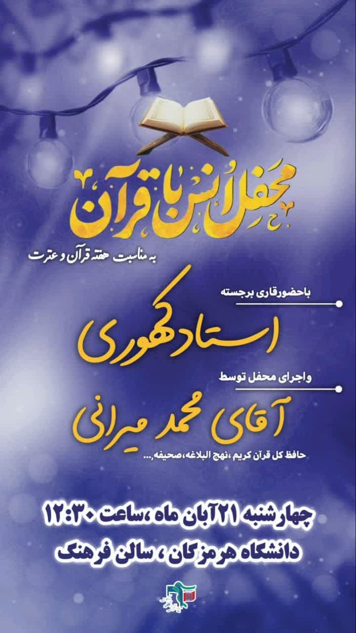 به مناسبت گرامیداشت هفته قرآن و عترت، محفل نورانی انس با قرآن در دانشگاه هرمزگان برگزار می‌گردد. در این برنامه معنوی، استاد کهوری — قاری برجسته و خوش‌خوان قرآن کریم — با تلاوت آیاتی دل‌انگیز از کلام وحی، فضای دانشگاه را عطرآگین خواهد کرد.