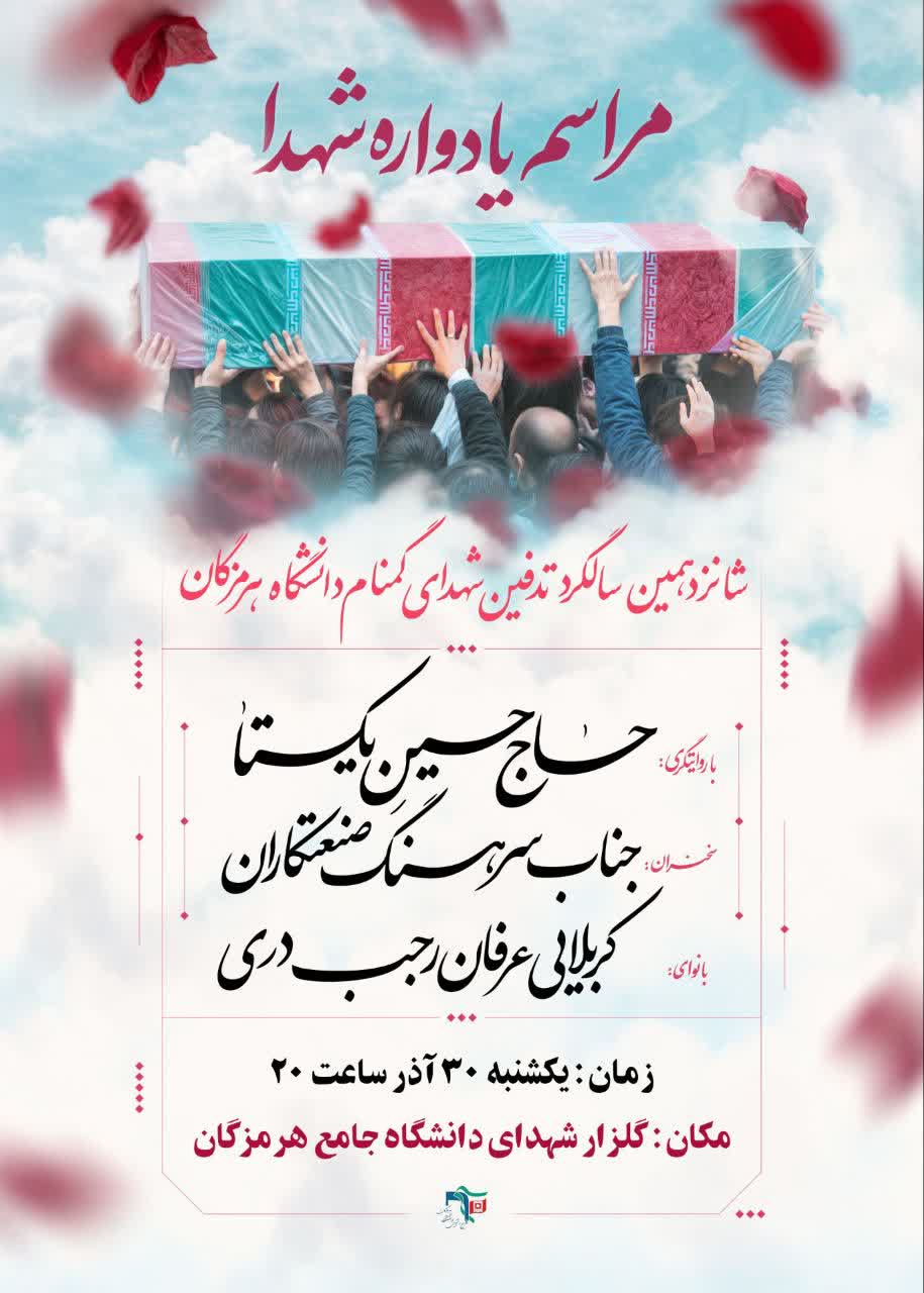 این یادواره روز ۳۰ آذرماه، ساعت ۲۰ در گلزار شهدای دانشگاه هرمزگان برگزار می‌شود و حضور پرشور دانشگاهیان، جلوه‌ای از قدرشناسی و ادامه راه روشن شهدا خواهد بود.